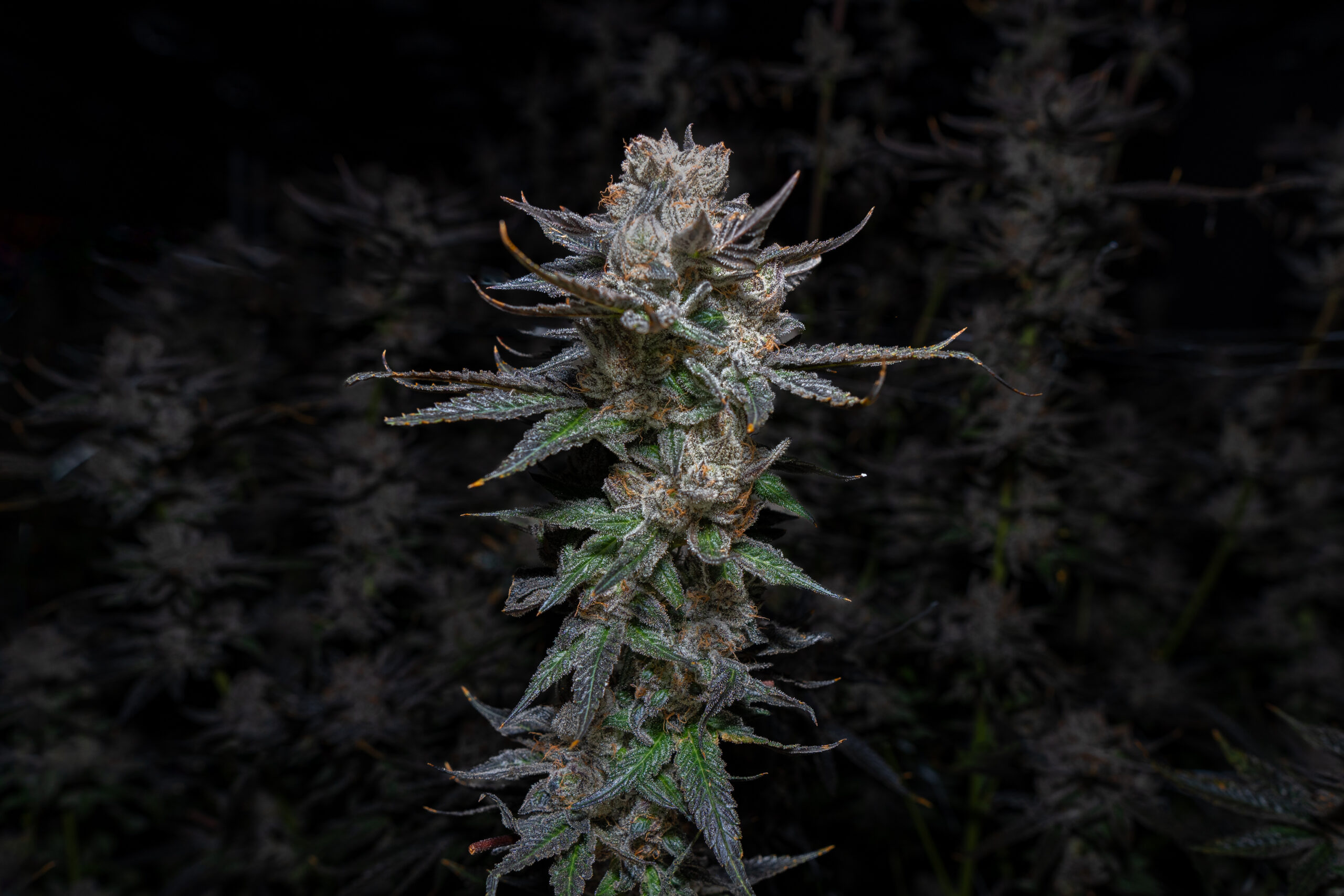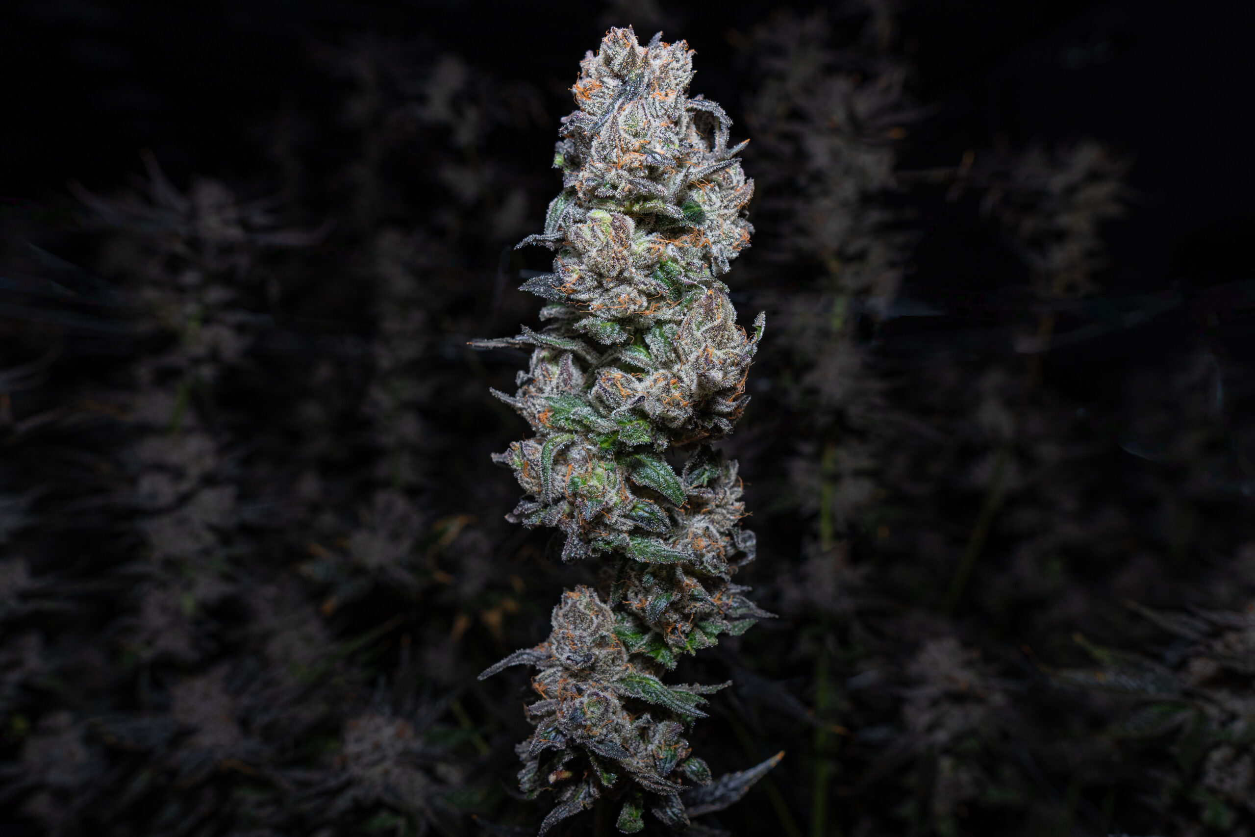 Coka by Compound Genetics: dark green with purple buds. Spicy, fruity, gassy scent. Dense frosty buds.